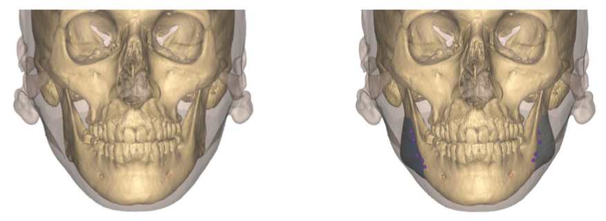 Lorsqu’un patient souhaite avoir des angles mandibulaire plus présents on peut proposer un Chin-Wing, une technique d’ostéotomie sagittale modifiée ou choisir de poser des prothèses réalisées sur mesure à partir d’un Cone Beam grand champ réalisé chez Orthognathic Paris. Les images sont intégrées numériquement ce qui permet de dessiner précisément le volume et la forme des implants souhaités.